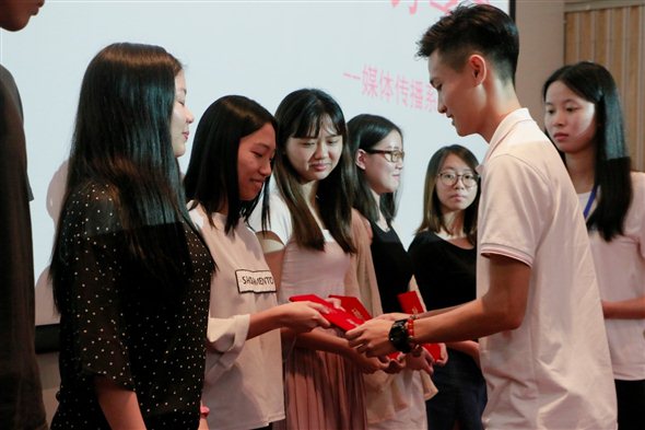 为了分享会能够顺利进行,工作人员们提前两小时到达现场准备。会议的主要参与人员为辅导员赵韵姬老师、党亚男老师以及媒体传播系大一新生。在主持人梁靖康同学、陈静同学的介绍下,五位主讲人梁宝莹同学、崔恺同学、谢慧璋同学、张嘉俊同学、巫嘉瑜同学分别就如何与他人相处、怎样获得奖学金、如何成为优秀干事、在大学里的勤工俭学之路以及如何打造温馨和睦的宿舍五个方面演讲并接受同学们的提问,现场气氛渐趋热烈。最后还特别设置了为14级系学生干部颁发杰出贡献奖和授予聘书的环节,以对他们一年以来的工作和对系部的贡献表示肯定。