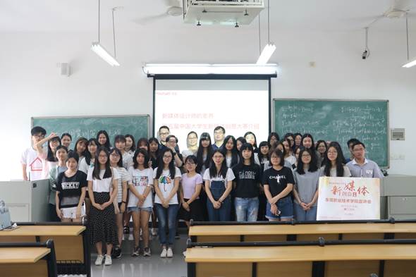 新媒体出版物的设计是离不开交互设计师、视音频编辑师等相关职业的,继而为“如何做一个好的作品?”的问题为同学们提供了设计宝典。在播放历届中国大学生新媒体创意大赛回顾视频后,场内人员进行合照。