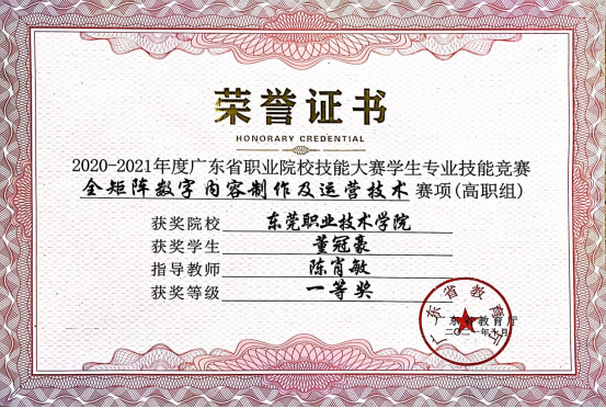 近期,广东省教育厅颁发了2020-2021年度广东省专业技能大赛获奖证书,数字媒体学院数字出版专业2018级学生董冠豪在“全矩阵数字内容制作及运营技术”中表现出色,获得一等奖。这是我院第一次获得该赛事奖项。