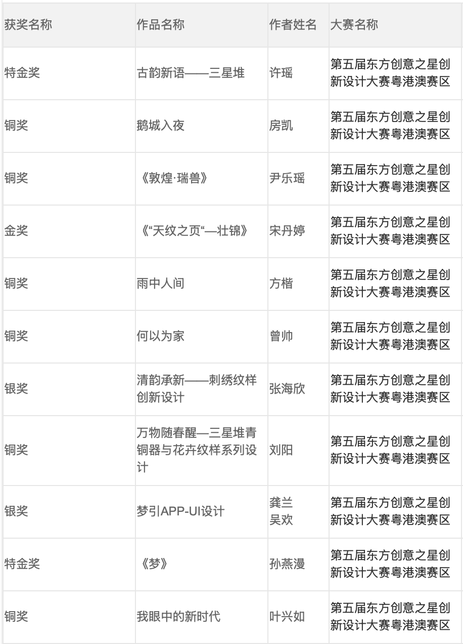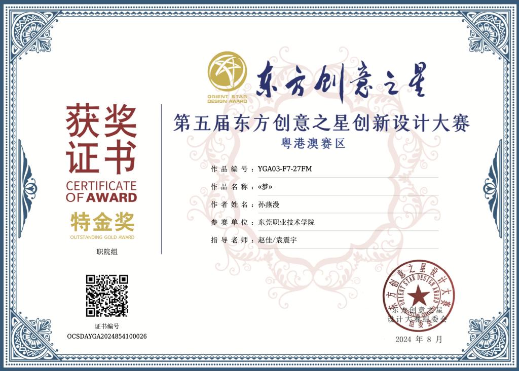 近日,2024年第五届东方创意之星创新设计大赛全国总决赛的获奖名单正式公布。其中,我院学生孙燕漫的作品《梦》和许瑶的作品《古韵新语—三星堆》荣获全国总决赛铜奖;其他作品荣获粤港澳赛区特金奖2项、金奖1项、银奖2项、铜奖6项。