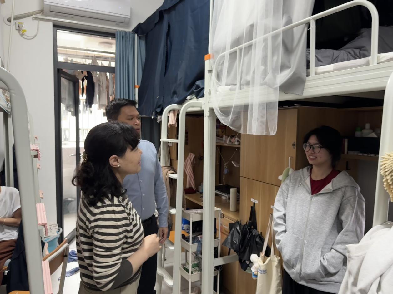 为全面提升我院学生宿舍管理与服务水平,深入掌握学生的身心健康状况及需求,2025年3月11日下午,创意设计学院开展学生宿舍走访工作。本次走访工作由学院党总支书记车美娟带队,党总支副书记姚志坚及辅导员夏雨溪、毕嘉炜一同深入走访学生宿舍。