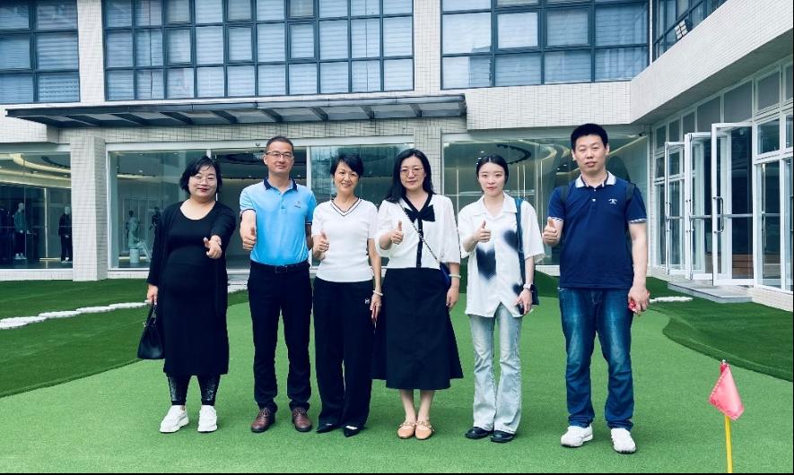 教师与通伟服饰董事长秘书容靖君在企业高尔夫服饰展厅合影