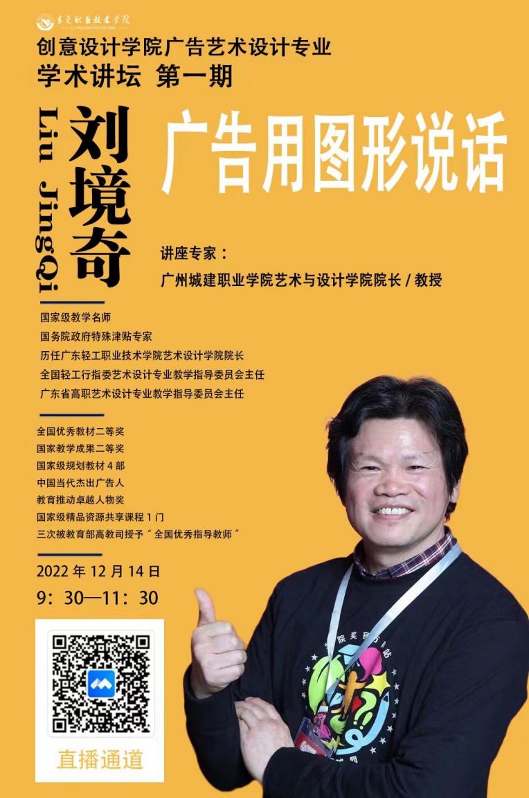 2022年12月14日上午,创意设计学院邀请国家级教学名师刘镜奇教授线上开展了“广告用图形说话”的主题讲座,学院主要领导、专业教师、专业学生约300人参与了学习。