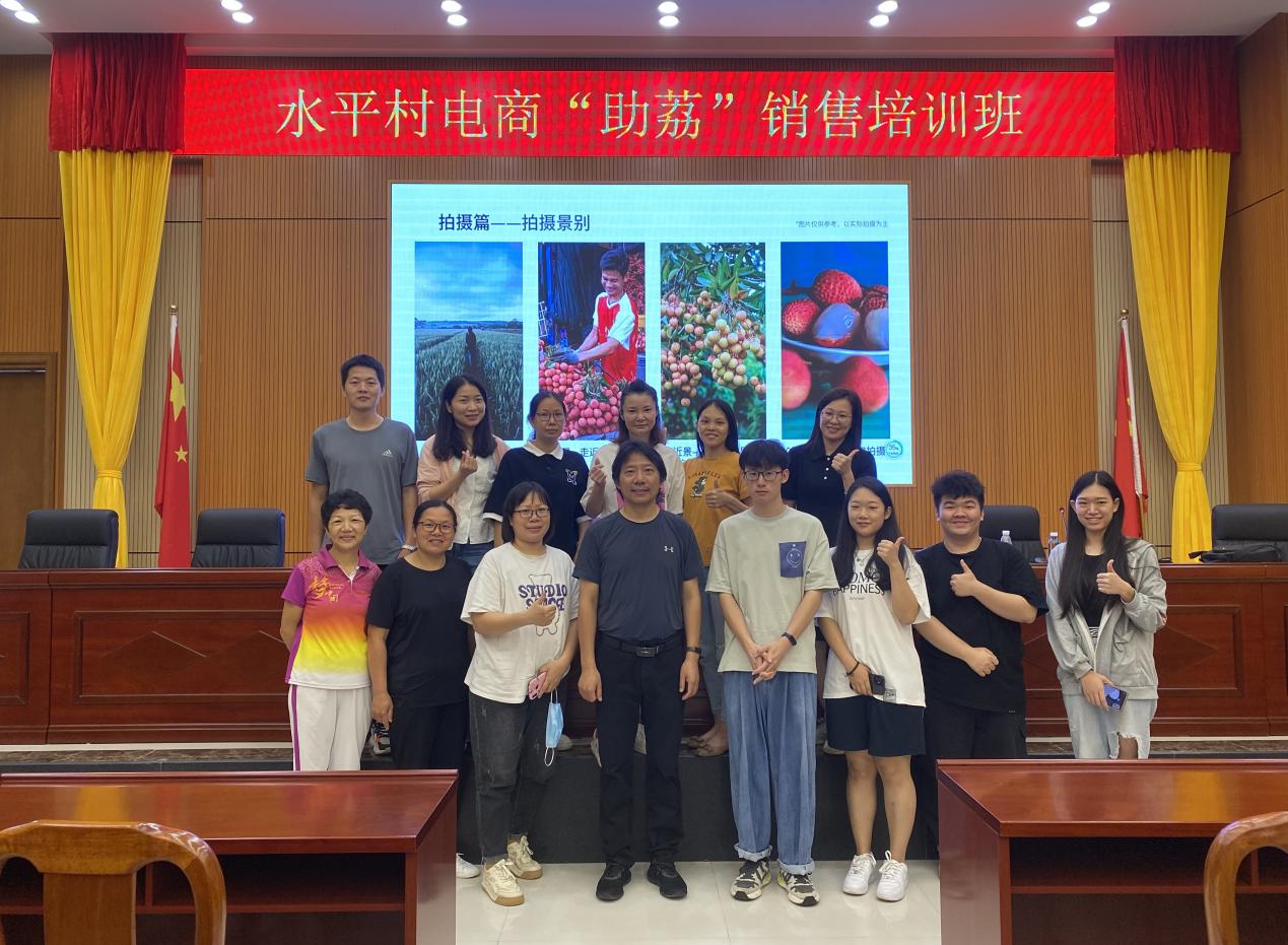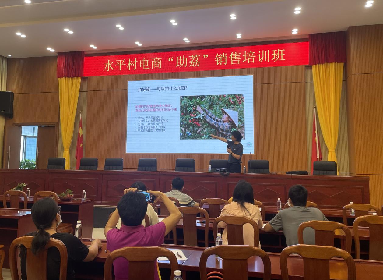 6月15日上午,应东莞市大朗镇水平村村委邀请,创意设计学院学院张红华老师给20余名荔农开展荔枝短视频直播培训。本次培训以现场实操的模式讲解短视频拍摄技巧,并对直播间搭建、销售渠道、增加粉丝、达成销售等方面做了详解,荔农们纷纷表示“助荔”销售培训非常实用,为他们增收致富带来新的途径。