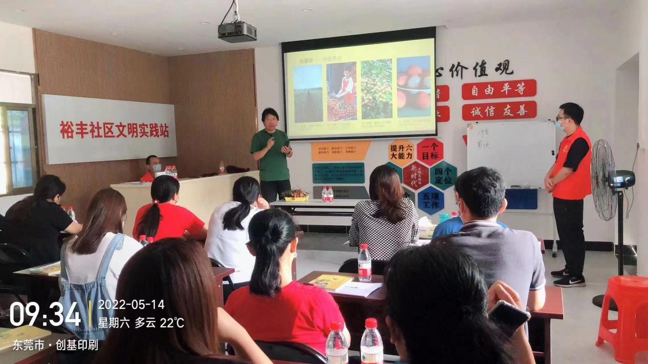 5月14日上午,在荔枝即将上市的时节,东莞市樟木头镇裕丰社区30余名种植荔枝的果农在张红华、刘方伟老师指导下,学习拍摄短视频技巧,让以往自发在网络上推销的荔农更加专业化,助力乡村振兴。裕丰社区在引导荔农利用网络平台开启销售的新模式上勇于作为,积极帮扶,创意设计学院学院广告设计专业张红华老师根据前期与社区对接的课程需求,精心制定了本次培训课程,为荔农后续进行荔枝直播销售、视频剪接、图文编辑等需求传经授道。课程中还包含国内电商市场分析、发货售后处理等基础知识,以现场实操的模式,手把手教学,以现场道具、户外果树等场景传授短视频拍摄剪辑、直播间搭建等技巧。