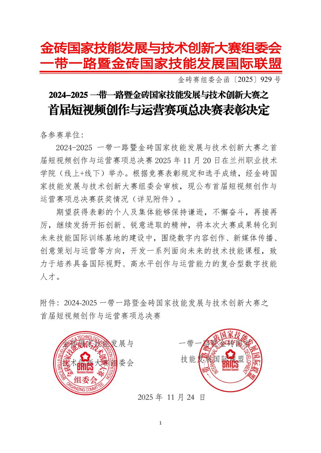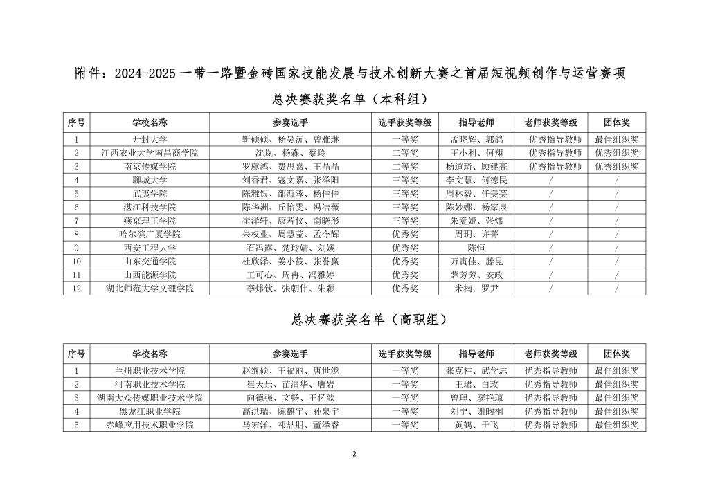 2024-2025一带一路暨金砖国家技能发展与技术创新大赛之首届短视频创作与运营赛项总决赛于2025年11月20日在兰州职业技术学院举办。由我院传播与策划专业陈肖敏、王雪莹指导,钟璐仪、阮彦朝、王思婷组成的参赛队伍获得高职组第二名,我校获优秀组织奖。