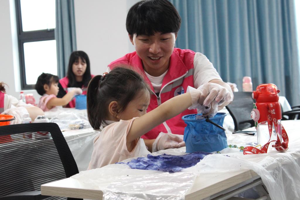 创意设计学院第一党支部联合服装设计专业黄文萍老师指导的简衫手作社于2024年4月17日在人文艺术大楼809开展了“美学美育,欢乐童趣”——我为教职工做实事系列志愿服务活动。这次活动旨在宣传传统民间手工艺--蓝染,让小朋友通过亲身参与体验,增强他们对传统文化的认知和对美的欣赏能力。