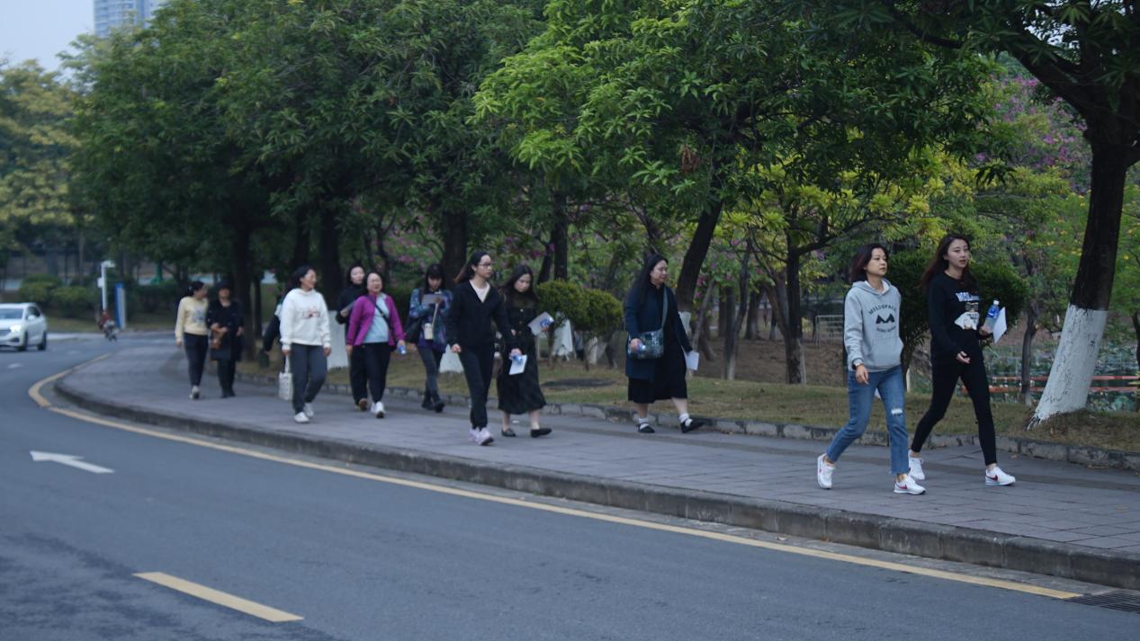 徒步路线为东莞职业技术学院如意湖环湖,沿线设立打卡站,参与者通过相应任务完成打卡集章。一路上党员们昂首阔步、意气风发、斗志昂扬,大家互相交流、讨论入党初心、分享工作经验与学习心得。徒步结束后,各支部还进行了党课学习。