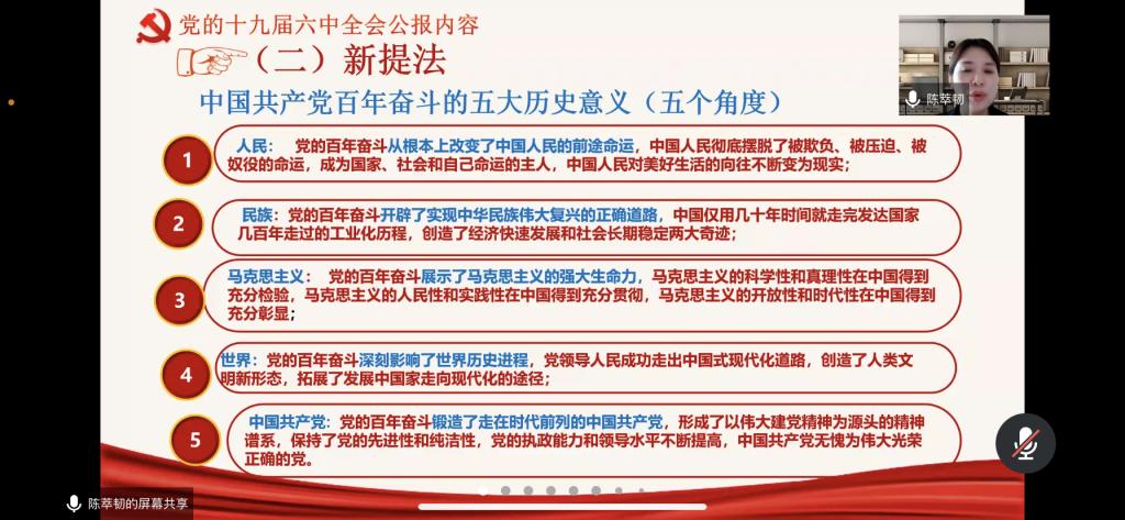 会上,陈萃韧老师围绕党的十九届六中全会召开的背景、意义、主要内容,清晰明了地阐述了《决议》在内容上的两个鲜明特点、中共百年历程的四大时期、党百年奋斗取得的重大历史性成就、中国共产党百年奋斗五大历史意义及中国共产党百年奋斗十个坚持宝贵历史经验,内涵丰富、重点突出,让师生们受益匪浅。