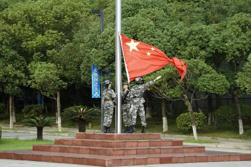 伴随着激昂雄壮的《义勇军进行曲》,升旗手振臂一挥,五星红旗冉冉升起,全体学生庄严肃立,高唱国歌,向国旗行注目礼。