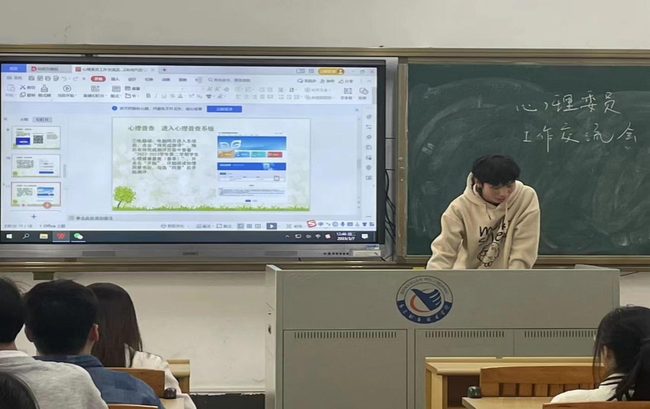 会议中,老师讲解了接下来对班级心理委员的培训与考核的相关工作要求。心理部干事为同学们讲解心理普查工作的操作流程,并介绍了学校心康中心的开放时间与预约方式。