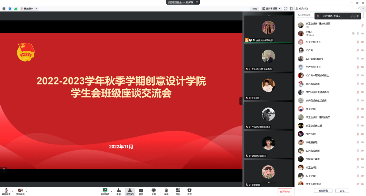为关心学生的学习生活状态,倾听同学们的心声,切实解决同学们的实际问题。创意设计学院学生会于11月30日下午召开了班级座谈线上交流会,各班级代表、院学生会全体成员、院学生会指导老师夏雨溪参加了本次会议。