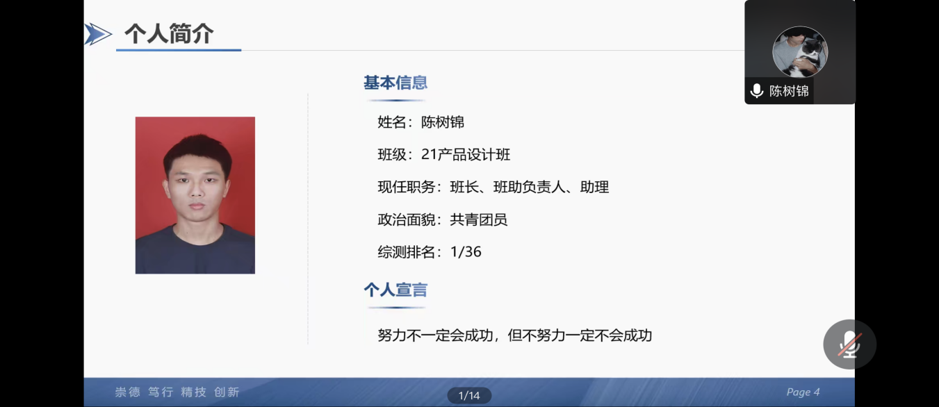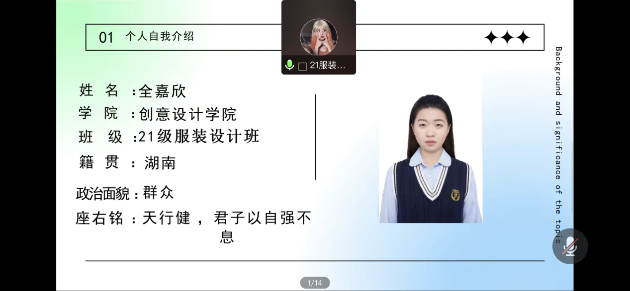 21服装设计班的全嘉欣,主题:“天行健,君子以自强不息”。从她的分享中得知,她把学习当成一种兴趣,明确有规划与定位自己的目的。