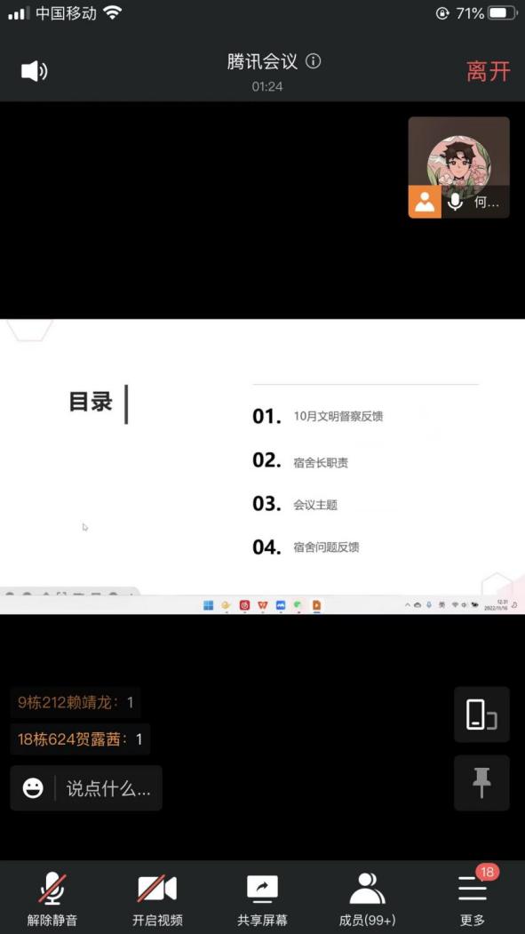 11月16日12点30分,院自律会召开2022-2023学年秋季学期第一次宿舍长线上会议。院自律会指导老师夏雨溪、全体宿舍长、自律会成员参与了本次会议。