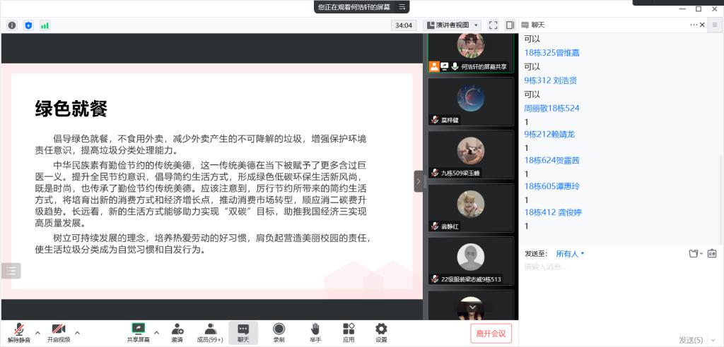 会议以“绿色校园,绿色就餐”为主题,主要内容包括:通报10月份学校文明大督查结果,明确宿舍长职责、宿舍长的考核与奖励办法,学习生活垃圾分类知识,倡导绿色就餐,提高垃圾分类处理能力。夏雨溪老师再次明确了相关宿舍管理条例,提醒同学们注意宿舍安全,严禁使用违规电器。会议最后,由宿舍长们提问,自律会成员汇总整理后反馈至相关部门处。