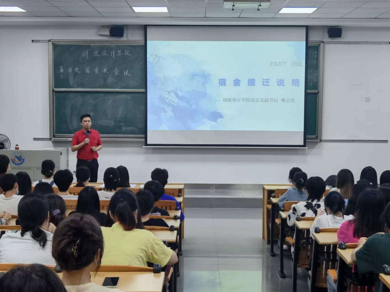 为进一步加强我院学生宿舍管理工作,形成良好学风和宿舍文化,6月15日14点30分,2022年春季学期第四次宿舍长会议在教四104教室举行。创意设计学院党总支副书记姚志坚、创意设计学院自律会指导老师夏雨溪及20、21级全体宿舍长参加会议。姚志坚副书记讲解了本次全校宿舍搬迁的总体情况,让大家初步了解搬迁的构思及计划。夏雨溪老师就目前学生宿舍管理中所存在的问题,再次重申相关管理条例,其中包括晚归、夜不归宿、违规电器等宿舍违纪行为的处理办法及服务消过制度,明确了宿舍长的职责、宿舍文明督查的注意事项等。夏老师强调,各宿舍务必高度注意用电安全,严禁使用违规电器、严禁电动车进入宿舍区域。