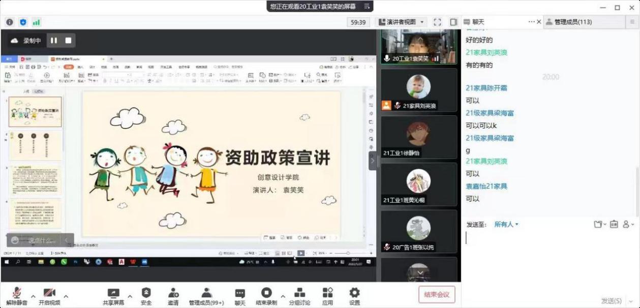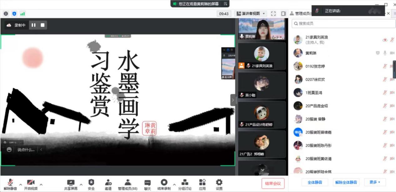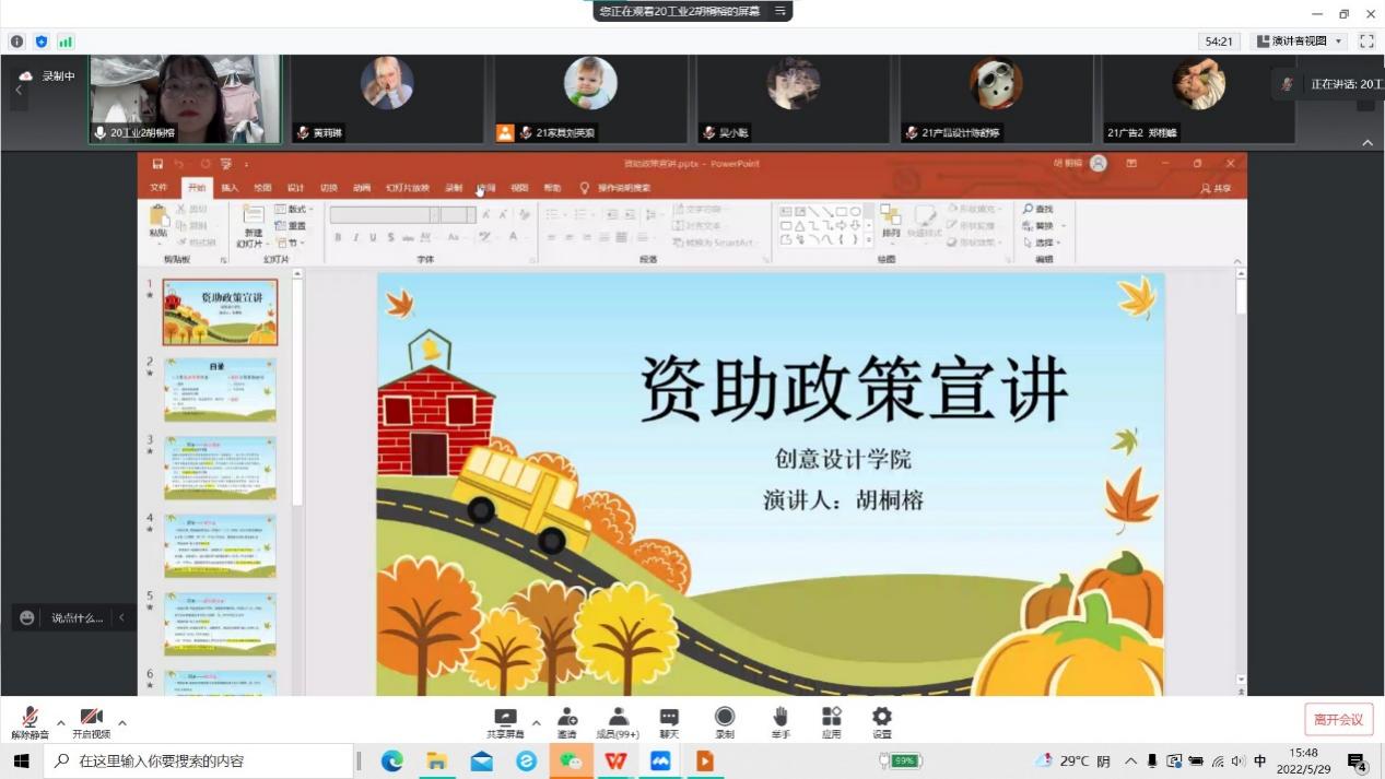20级工业设计2班胡桐榕和20级产品设计班黄莉琳,介绍了国家励志奖学金、国家助学金、学院助学金等助学政策以及对名家字画作品案例进行分析,讲解中国水墨画、书法发展历史等。
