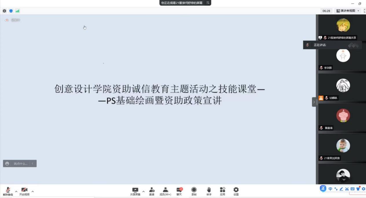 21级家具设计班陈桦怡和21级服装设计班何舒停给同学们介绍了国家资助政策和申请资助的相关流程以及PS的基础快捷键的操作方法和画笔(厚涂)的方法。