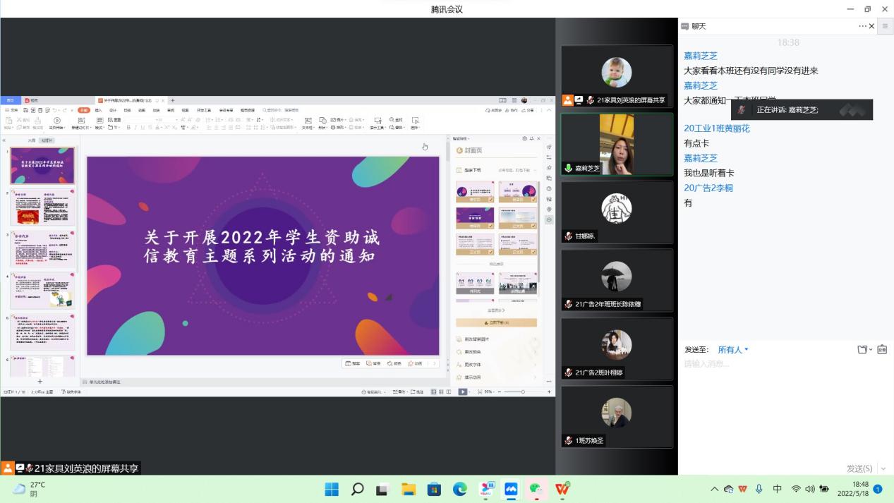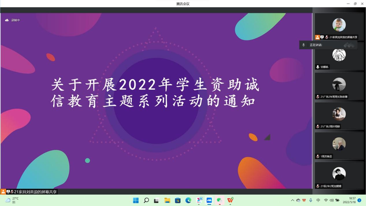 为进一步切实做好高校国家资助政策宣传,推进受资助学生的感恩教育和社会责任感教育,加大学生资助宣传力度,扩大宣传效果,让更多的学生了解资助,我院特此组织了2022年学生资助诚信教育暨“学生资助宣传大使”动员大会。5月18日,我院召开了“学生资助宣传大使”动员大会线上会议,由我院辅导员毕嘉炜老师、甘娜婷助理和我院受助学生参与此次会议。