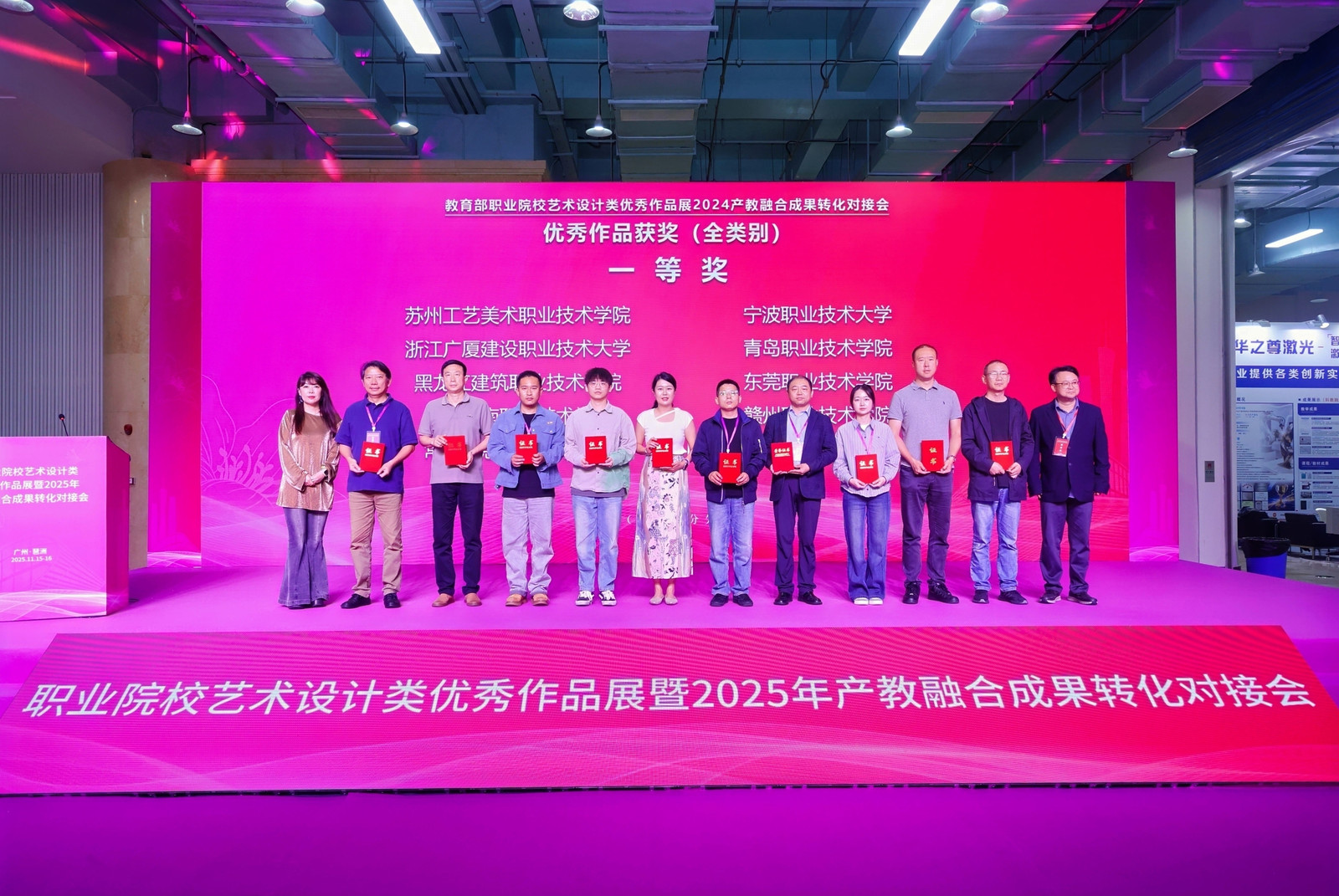 2025年11月13日-16日,教育部职业院校艺术设计类优秀作品展暨2025年产教融合成果转化对接会在广州琶洲中岱交易广场成功举办。此次作品展暨对接会,是教育部为全国职业院校艺术设计类专业搭建的展示以教促产、以产助教、产教融合的综合成果的高质量平台;我校创意设计与传媒学院(筹)经过前期一个多月的充分准备和精挑细选,共推选产品设计、平面视觉、工艺美术设计、数字设计、工业设计、图书插图等六大类别创意设计作品、非遗作品、校企合作作品50余件,在展览中与各高校同场竞技,作品荣获大赛一等奖3项、二等奖2项、三等奖6项;教育部职业院校艺术设计类专业教学指导委员会张来源秘书长在展会上对我校作品给予高度评价。